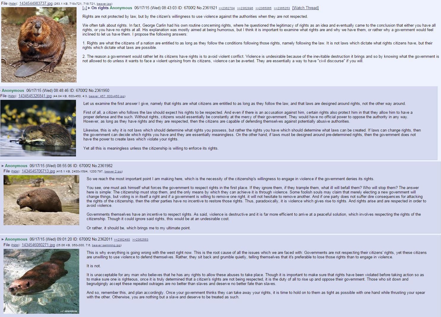 Before I go further, let me first explain what these Beaver transcripts are. They are a series of essays on various political and social topics posted on 4chan and other similar communities by a person who always posted pictures of beavers along with his posts. They are very insightful even if you may not agree with everything he says. As of now each essay is saved in individual screen caps and are posted around online randomly, sometimes in incomplete fragments. It’s my intention to have as much of them here as possible for preservation, and also to have them in easier to read formats along with the original screen caps for reference. I’ll post more of these in the future.