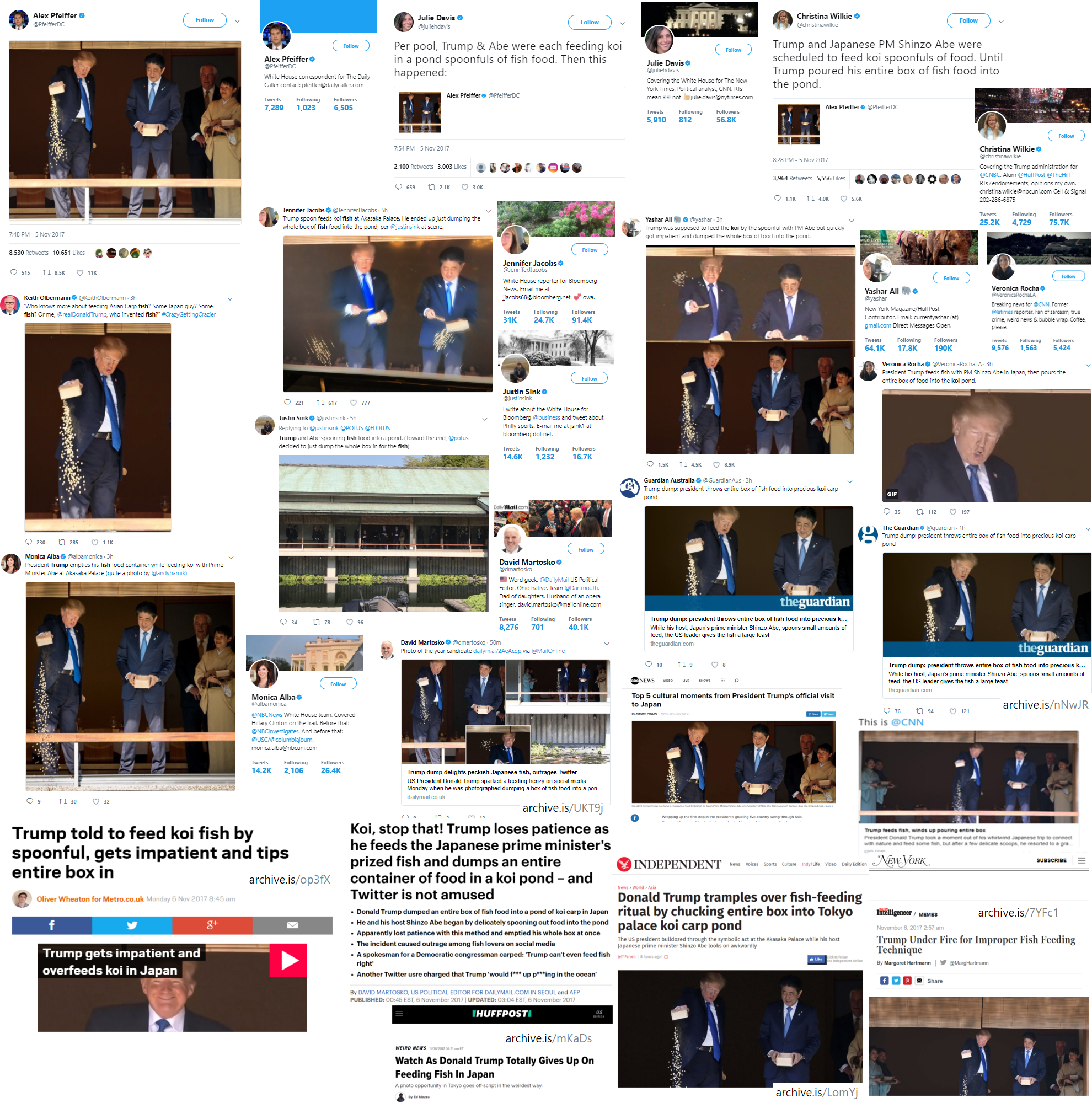 Very funny little incident happened earlier this week when Trump visited Japan. Apparently he dumped an entire box of fish food into a pond with a large number of Koi fish inside. Below is how CNN summarized this incident: