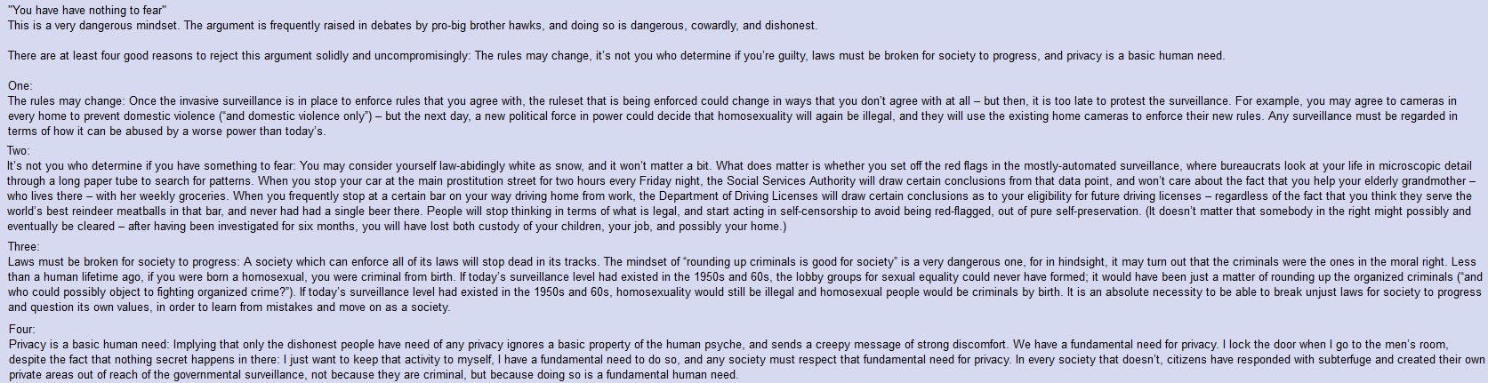 This is a very dangerous mindset. The argument is frequently raised in debates by pro-big brother hawks, and doing so is dangerous, cowardly, and dishonest.There are at least four good reasons to reject this argument solidly and uncompromisingly: The rules may change, it’s not you who determine if you’re guilty, laws must be broken for society to progress, and privacy is a basic human need.