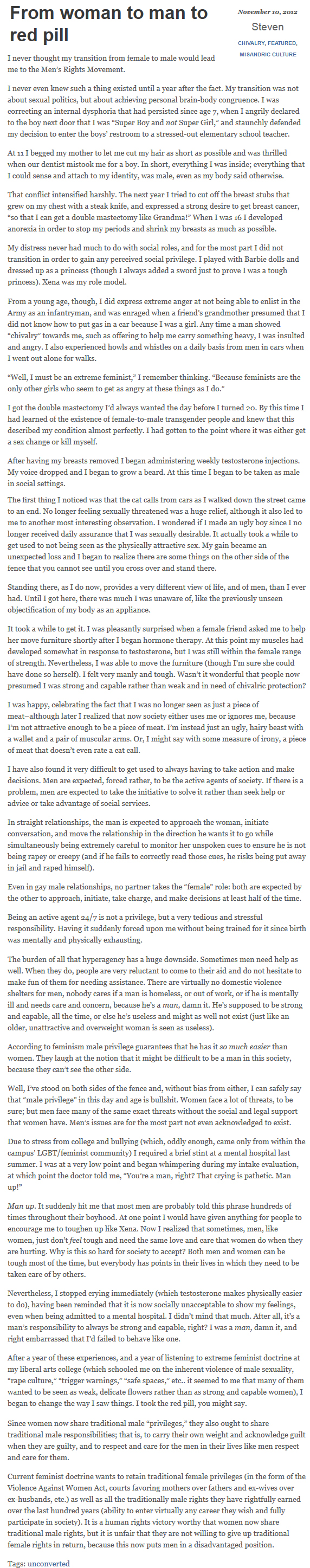A transsexual man speaks on male privilege Posted on March 18, 2020March 18, 2020 by templeofzagan A very interesting treatise from a man who was born biologically female on the differences between how they were treated by society as a woman and as a man: Share this: Share on X (Opens in new window) X Share on Facebook (Opens in new window) Facebook Like Loading...