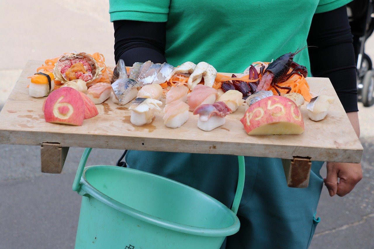 The feast included slices of raw fish, apples, crab and even a crawdad. The apples were carved with the animal’s name and age. The “rice” portions of the sushi were actually pieces of daikon radish.