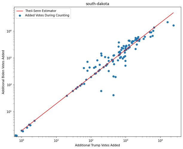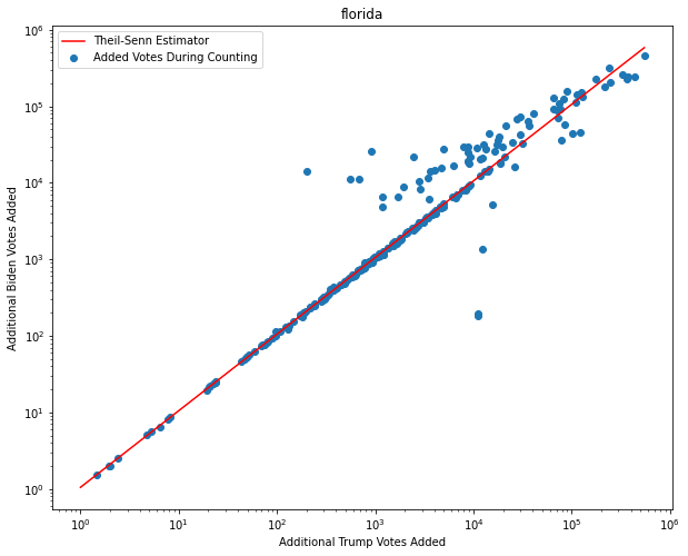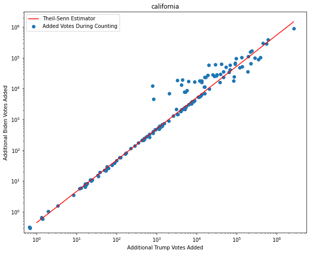 One of the first things that I noticed while exploring dataset is that there seems to be an obvious pattern in the ratio of new Biden ballots to new Trump ballots. As we can see on this log-log plot, for many of the counting progress updates, we see an almost constant ratio of Biden to Trump. It’s such a regular pattern that we can actually fit a linear regression model to it with near-perfect accuracy, barring some outliers.