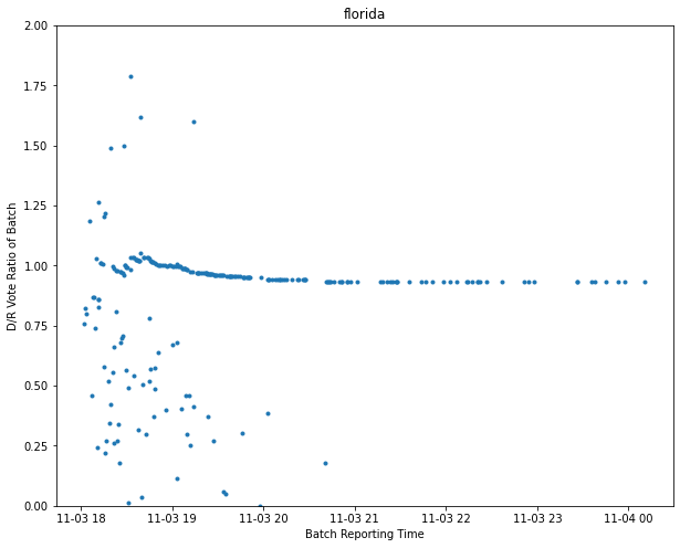 Here is a plot of the same Florida voting data, but this time it’s the ratio of Biden to Trump ballots, versus time. What we see is that the initial ballot reportings are very noisy and “random”.