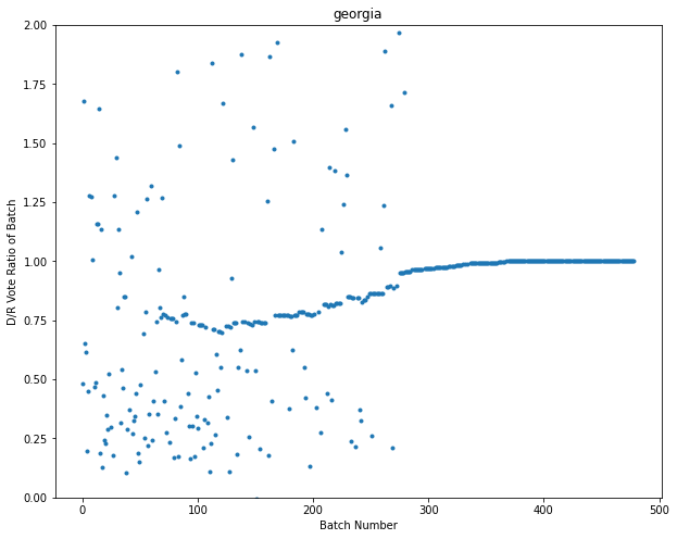 But then as counting continues, the D to R ratio in mail-in ballots inexplicably begin increasing. Again, this should not happen, and it is observed almost nowhere else in the country, because all of the ballots are randomly shuffled in the mail system and should be homogeneous during counting. The only exceptions to this are other suspect states that also have anomalies.
