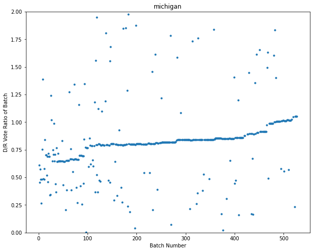 In Michigan, we see a combination of the Wisconsin strangeness, together with the GA/PA weirdness. We see both signs of contaminated ballot dumping, and ballot ratios drifting toward dems when they should not be.