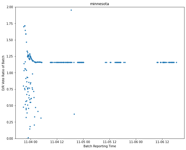 What we see in almost all examples across the country is that the ratio of mail-in Dem to Rep ballots is very consistent across time, but with a notable gradual drift from Dem to slightly more Rep. This slight drift from D to R mail-ins occurs again and again, and is likely due to outlying rural areas having more R votes. These outlying areas take longer to ship their ballots to the polling centers.