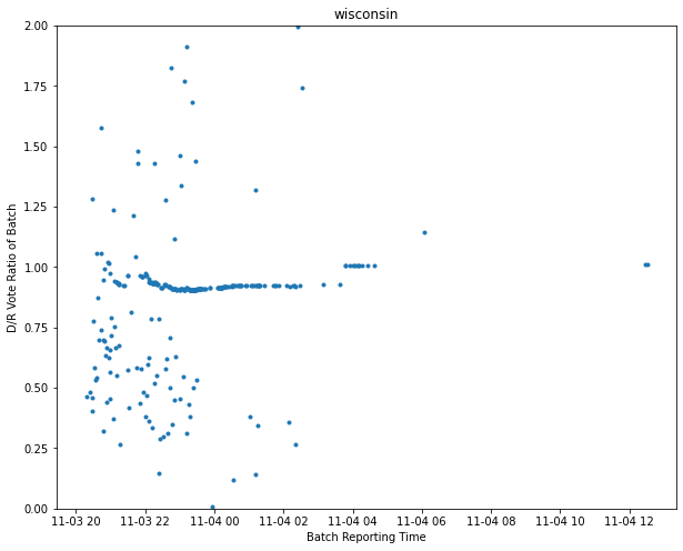 This is the Wisconsin vote counting history log. Again, on the Y axis we have the ratio of D to R ballots in a reporting batch, and on the X axis we have reporting time.