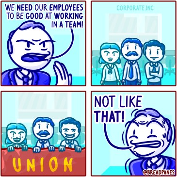 Despite how corporations always harp about the importance of leadership and teamwork, there are certain sorts of leadership and teamwork they’ll stomp out like a rhino stomps out a fire: The woman’s facial expression in the third panel is the best.