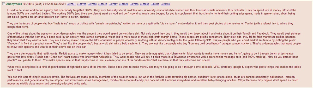 They are a demographic that reddit wants. Reddit exists to make money (which it has failed to do so far). They are a demographic that 4chan wants. Moot wants to make more money and he isn’t going to do it through bunch of tech-savvy geeks who love piracy. Reddit and 4Chan don’t want people who know what Adblock is. They want people who will buy a t-shirt made in a Taiwanese sweatshop with a pro-feminist message on it (and 500% mark-up). How do you attract those people? You pander to them. You make spaces safe so that they’ll come in. You cleanse your site of the “undesirables” that are there so that they will come and spend.