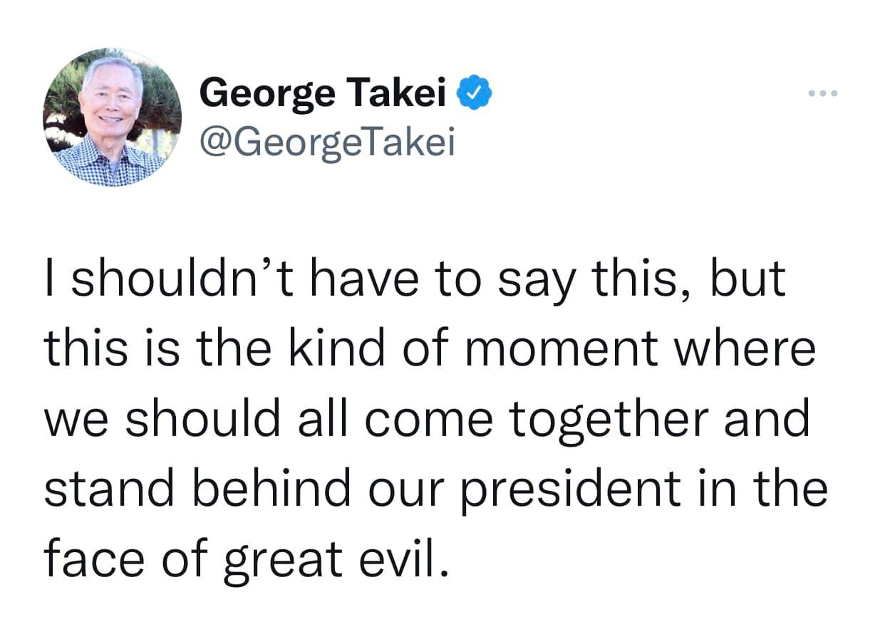 along with a picture of a tweet from George Takei with a similar, if not slightly condescending, message of: