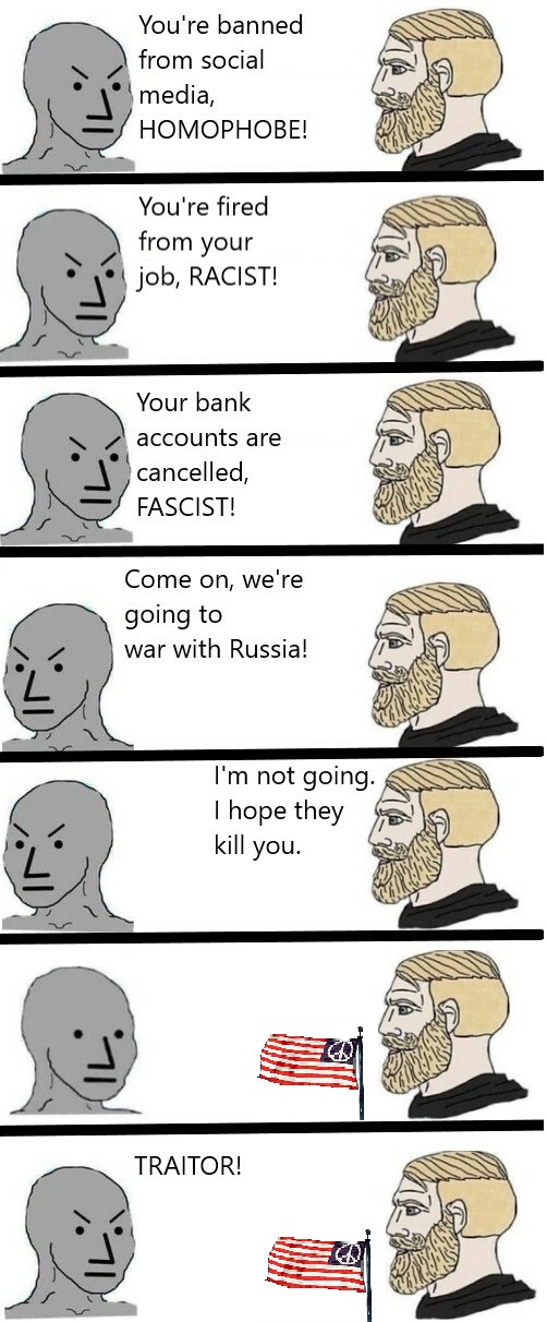 You stole my political, social, economic, spiritual and cultural power. You’ve unpersoned me for the color of my skin and for my sexuality. You’ve attacked me, belittled me, censored me and taught me and our children to hate ourselves, and have gaslit us that we’re the problem. Yeah i’m abandoning you in your moment of “crisis” for a war that does not serve me or my interests, but remember, you abandoned me first. My enemy isn’t in eastern europe, my enemy is in my own country. They march the streets and burn down buildings while claiming victimhood. They prattle on television about how they’re being oppressed in between ad breaks representing them disproportionally. WE. WIll. NEVER. FORGET.