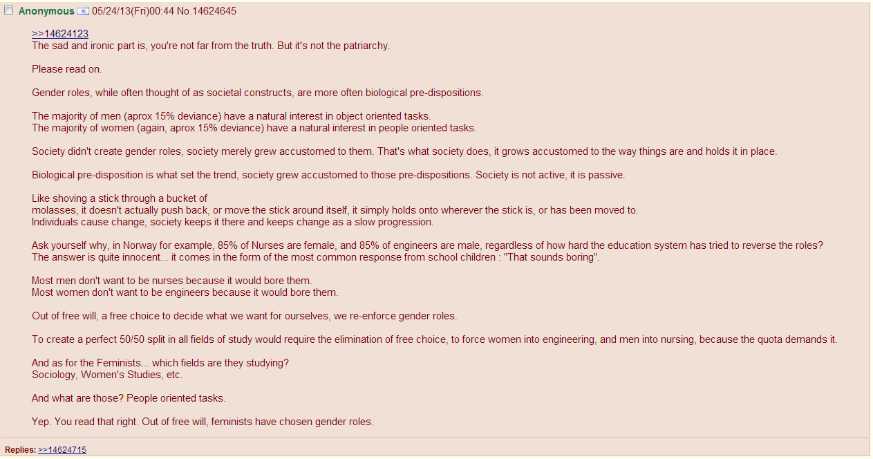An anon on 4chan offers an interesting take on how biology influences gender roles in society: