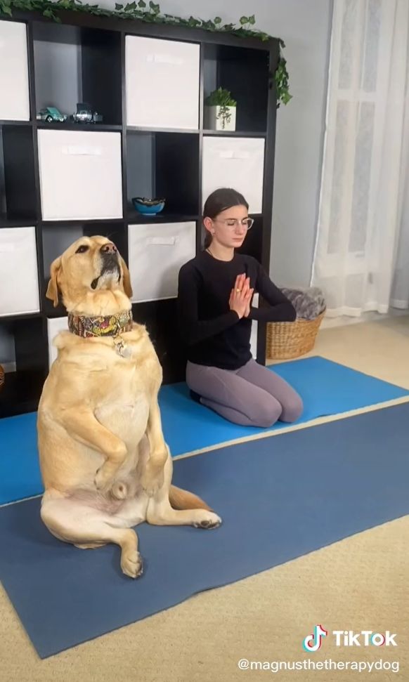 A Labrador Retriever named Magnus doing yoga exercises with his owner. Here is the both of them laying their yoga mats out: