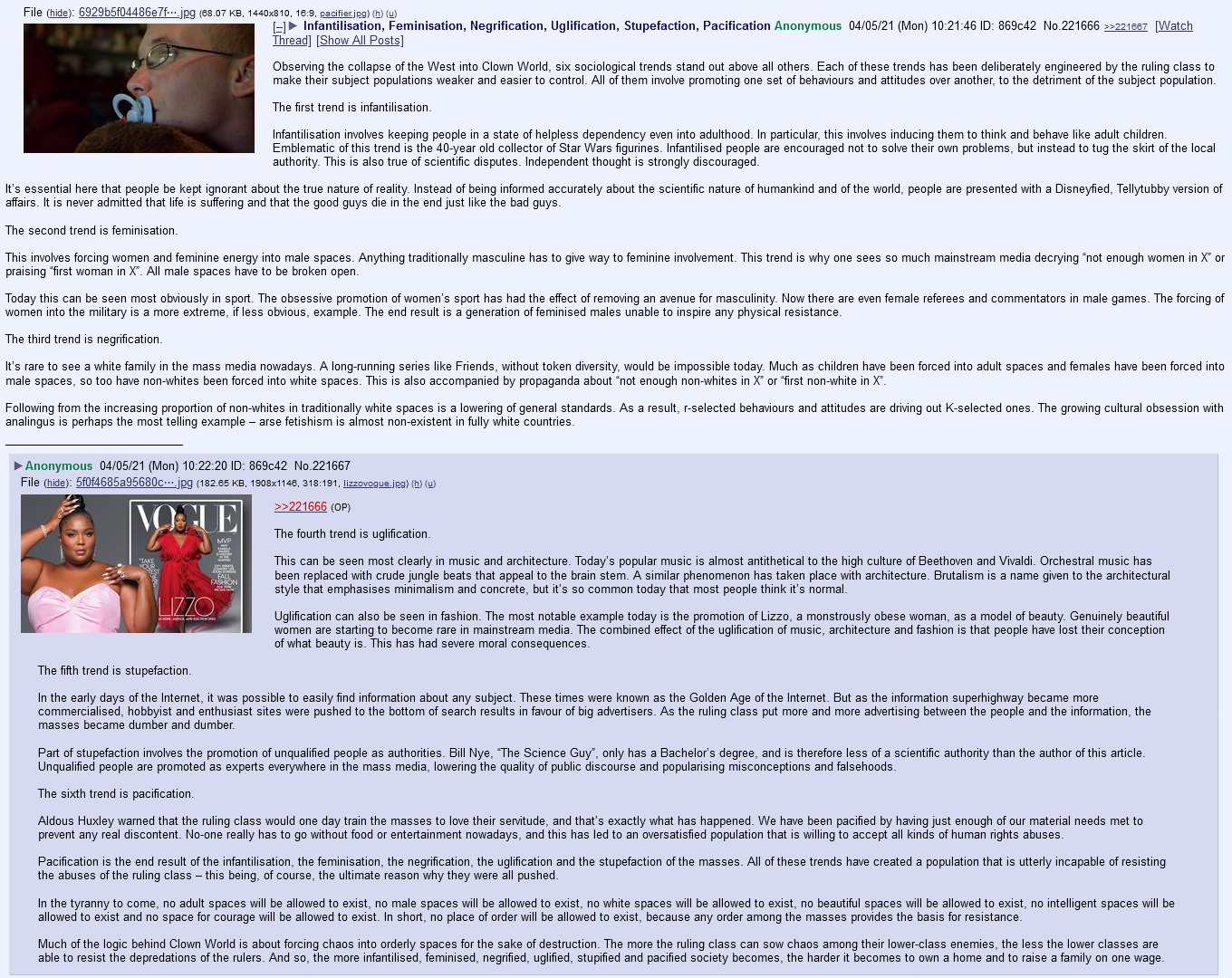 Pacification is the end result of the infantilisation, the feminisation, the negrification, the uglification and the stupefaction of the masses. All of these trends have created a population that is utterly incapable of resisting the abuses of the ruling class – this being, of course, the ultimate reason why they were all pushed.