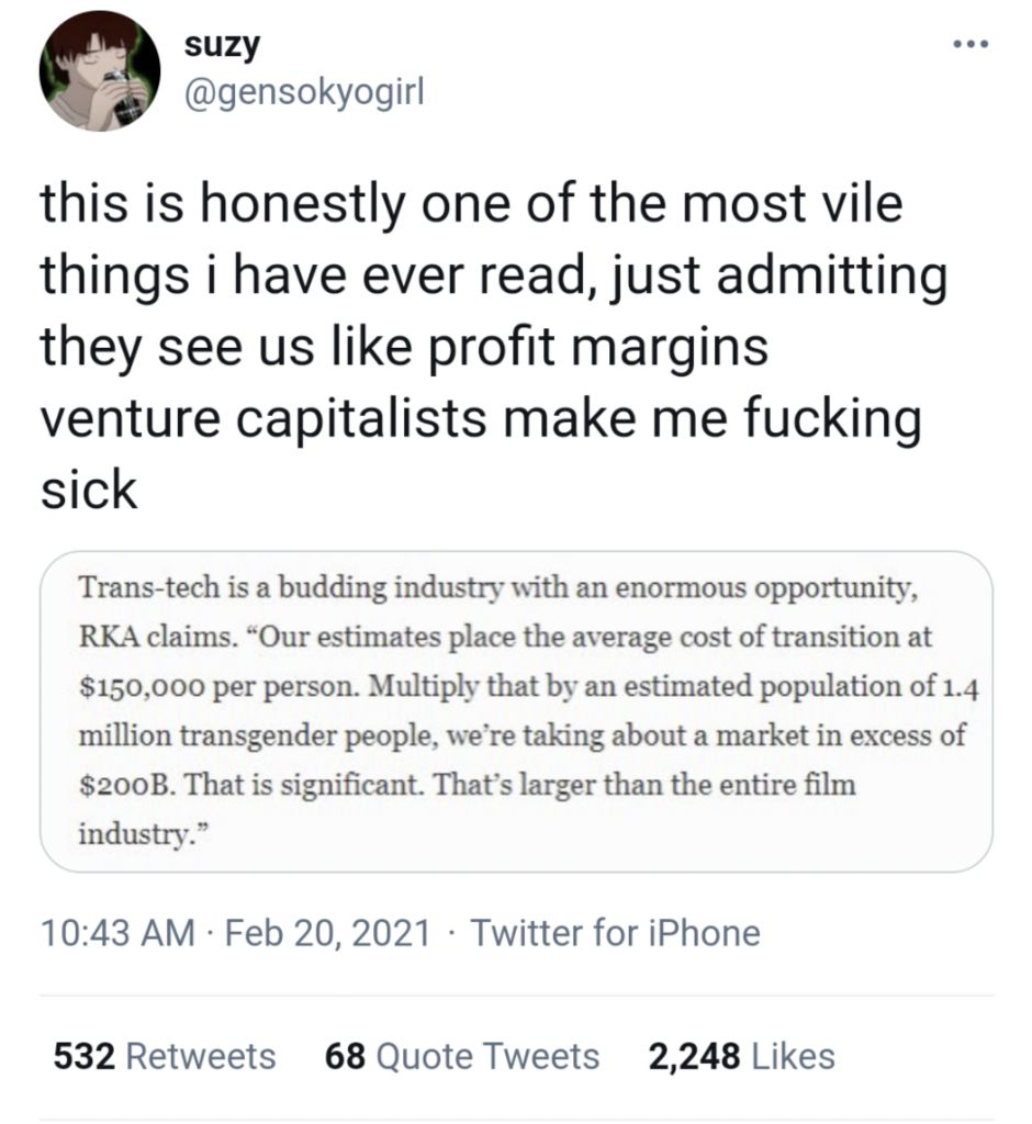 Similarly, the popularization and attention given to transgender people, a heretofore relatively unknown minority, over the past years appear to also have benefited unbridled capitalism/consumption. Transgender people require expensive surgeries to complete their transition, and would also stay on hormone treatments for the rest of their lives, assuring a continued stream of profit to the medical and pharmaceutical industries. The fact that big pharmaceutical corporations have already started seeing the transition process with the cold calculating eyes of a profit seeking machine is disheartening.