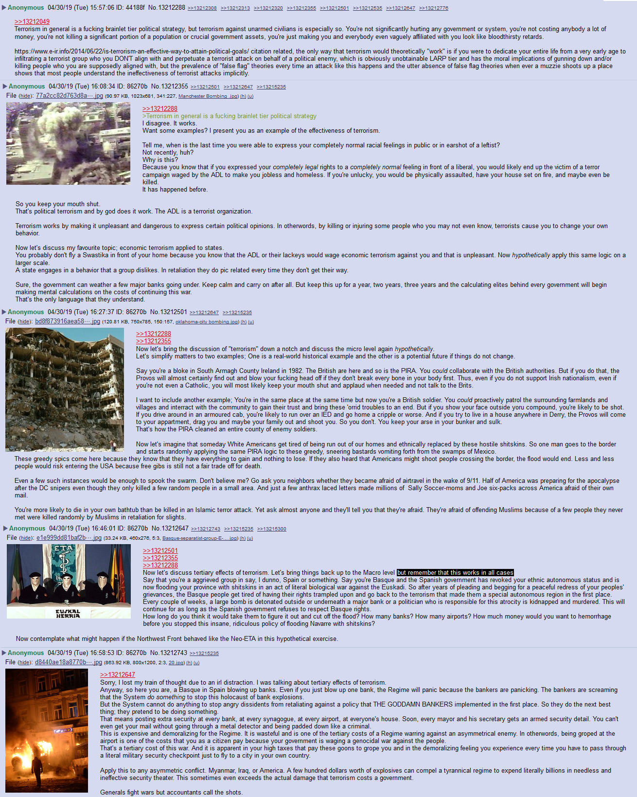 Two anons on an image board similar to 4chan discusses the topic of terrorism. The first posits that terrorism is largely futile, prompting a second anon to offer a surprisingly insightful and chilling rebuttal.