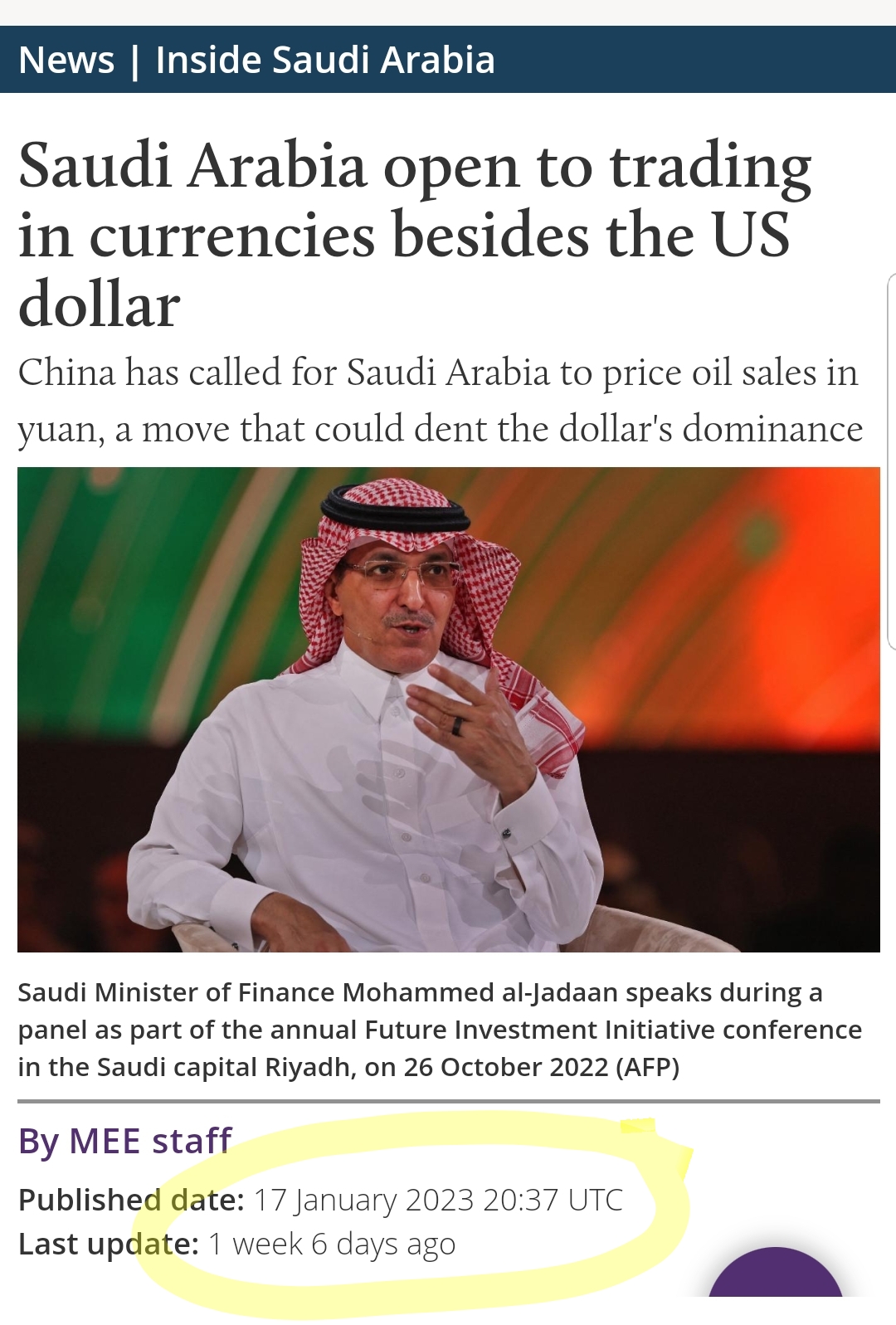 If you want to know WHEN the shit will hit the fan, and when America finally crumbles, watch the Saudis. As soon as they switch to something other than USD for oil purchases/sales, America is done for.