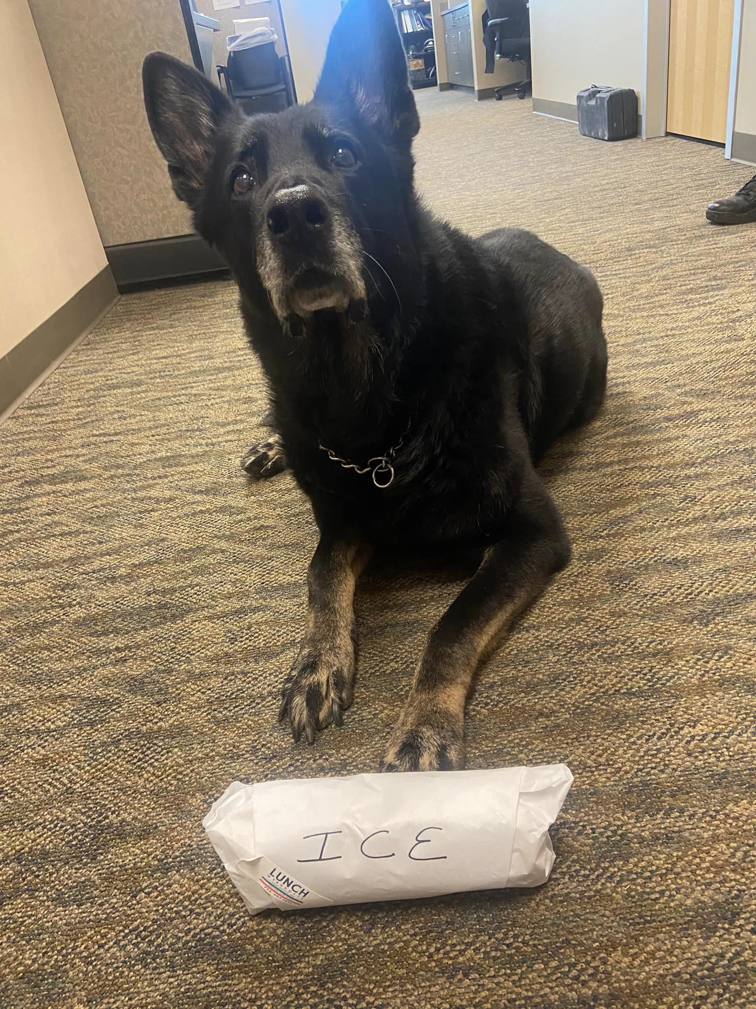 The incident happened two days ago at the station. Ofc. Barwig was eating lunch in the breakroom when he was called to assist with a person in the WPD jail. He quickly jumped into service, leaving his half eaten lunch on the table. A short while later Barwig and another officer returned to the breakroom only to find Ofc. Ice leisurely strolling out of the room licking his chops. Barwig’s entire lunch was gone….disappeared, vanished!