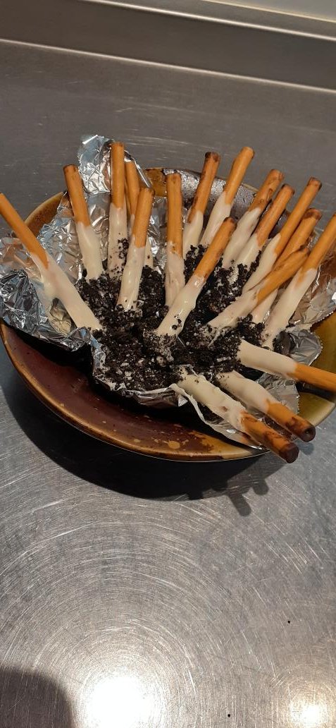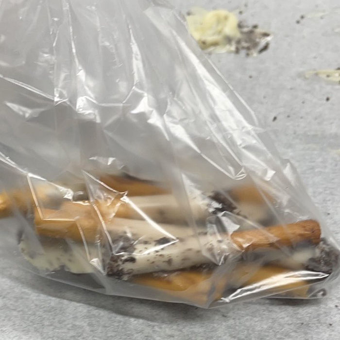 Upon closer inspection, these were pretzel sticks partially covered in white chocolate, with bits of black chocolate shaving on them, giving them an uncanny resemblance to sticks of half smoked cigarettes: