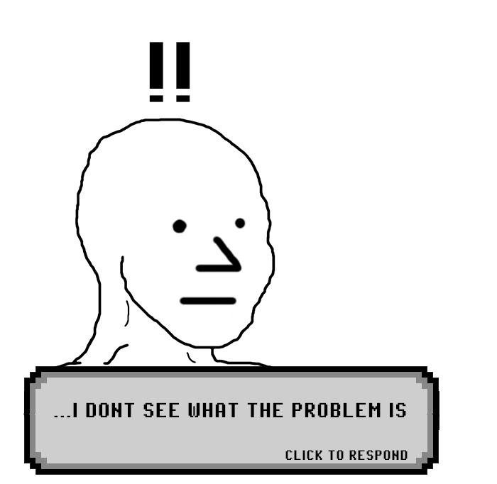 This is why the NPC meme is so fitting. They lack a quality that lies at the foundation of the human experience. It’s why they seem so devoid of a soul. It’s why you feel like you have the same interactions with dozens of different people. They are all running the same program and they will continue to run this until a new program has been entered by Rachel Madow or Facebook. Nothing you say or do will change the program. Nothing they see or experience in real life (from a bomb at an Ariana Grande concert to 10 vans of peace) will change the program.
