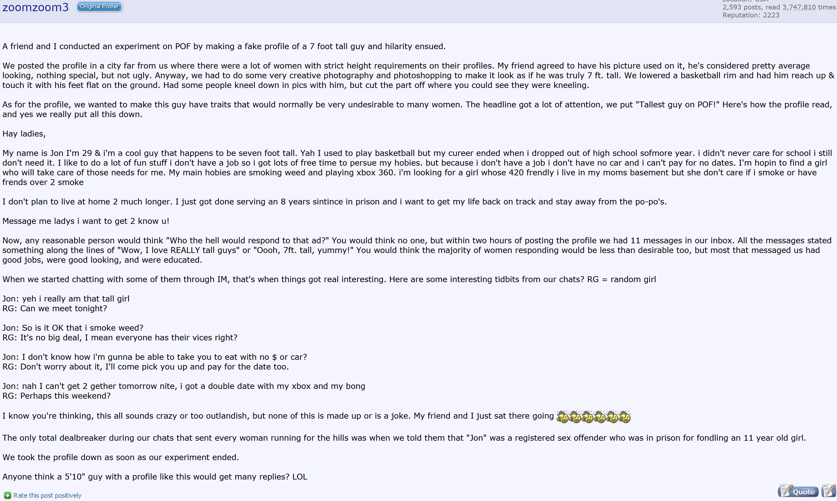 A friend and I conducted an experiment on POF by making a fake profile of a 7 foot tall guy and hilarity ensued.
