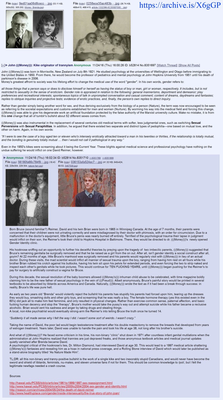 And what of Money? He faced some criticism in his time, his non-binary “clinic” shut down in 1971 after countless infant genital mutilations when the administration at John Hopkins realized that trannies are just depraved freaks, and those anonymous textbook articles and medical journal updates quietly vanished after Brenda became David.
