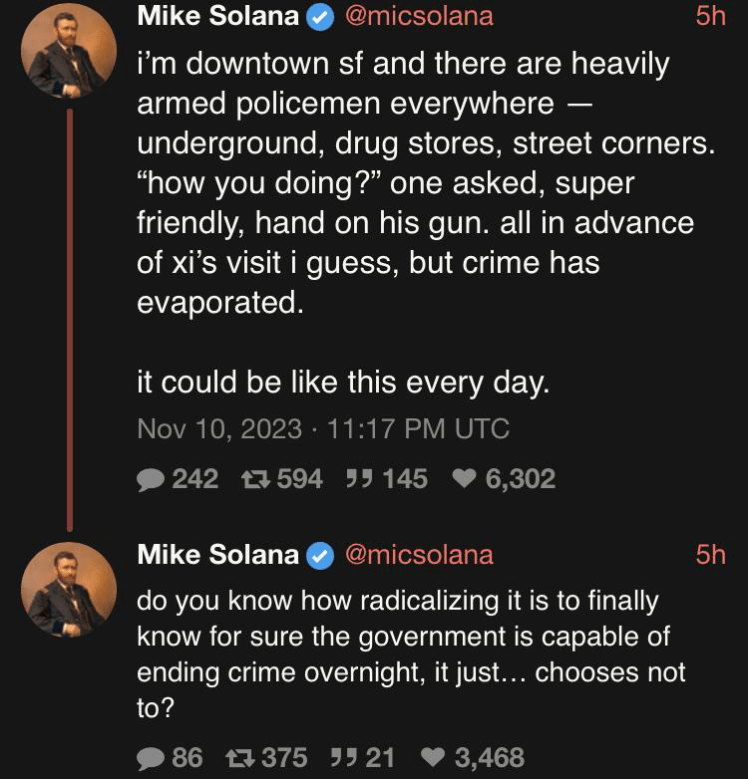 I’m downtown sf and there are heavily armed policement everywhere – underground, drug stores, street corners. “How you doing?” one asked, super friendly, hand on his gun. All in advance of Xi’s visit I guess, but crime has evaporated.