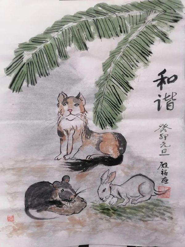 The animals were drawn in a realistic style, and for some reason banana leaves were drawn as the background. The drawing was titled “Harmony”, along with the finished date, artist’s name and even a seal stamp.