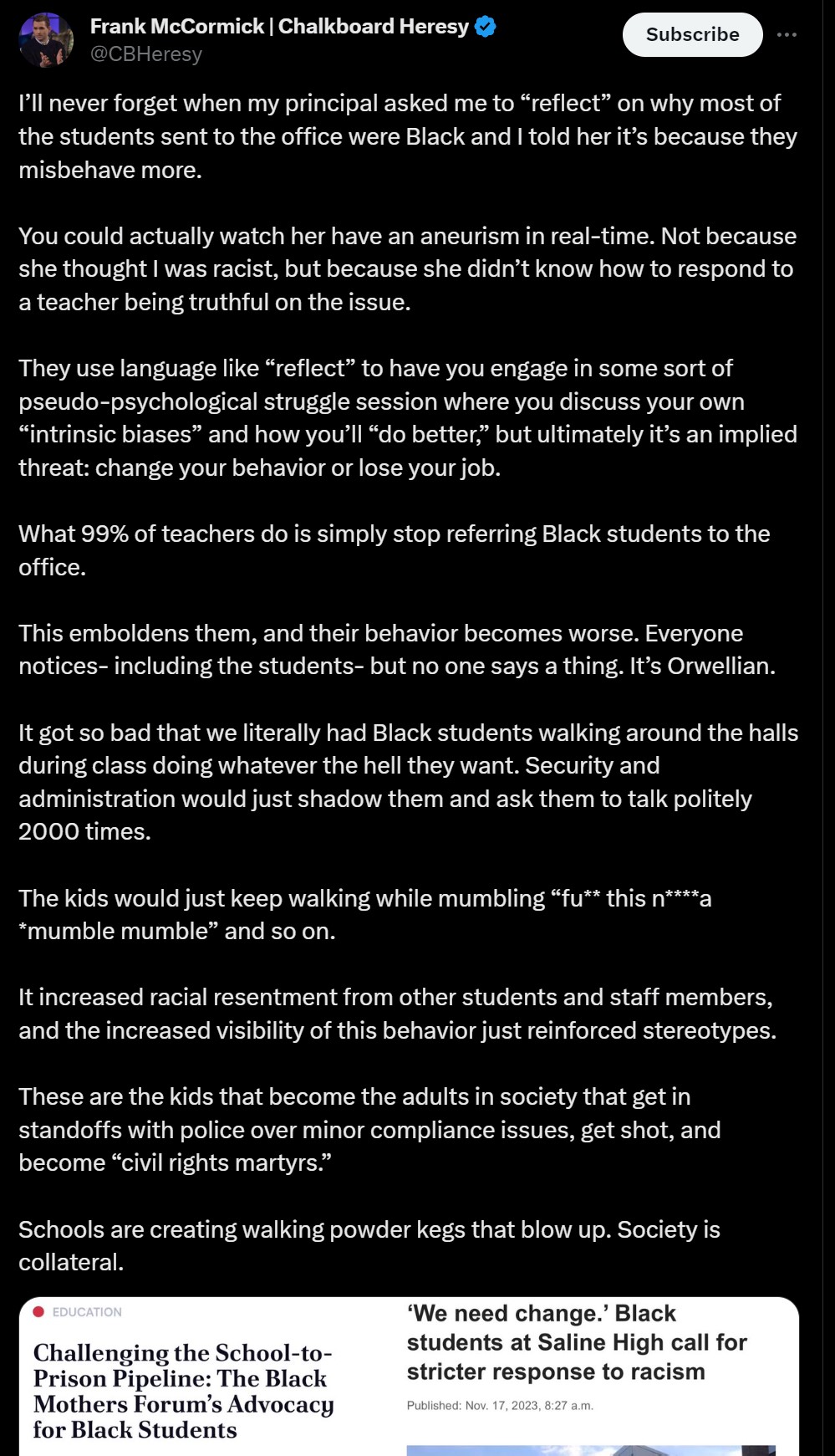 A short essay from a teacher, Frank McCormick, that has been gaining traction as of late on the behavior of his black students and how they fit in the school administration’s management of teachers: