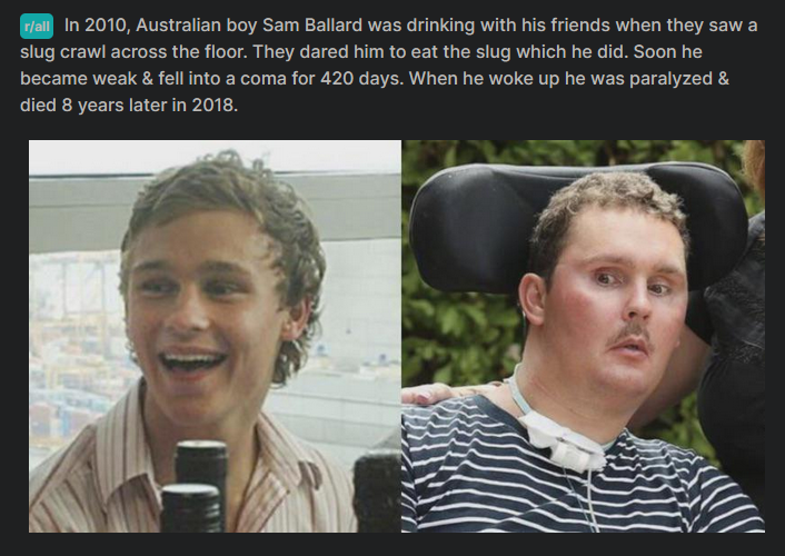 In 2010, an Australian boy named Sam Ballard, aged 19, was hanging out and drinking with his fellow rugby players at a local party. A garden slug came crawling across the backyard patio, and as part of an alcohol fueled dare, Sam ate it. Swallowed the poor creature whole. After eating the slug, Sam developed health complications, the symptoms of which included pain in the legs and general weakness.