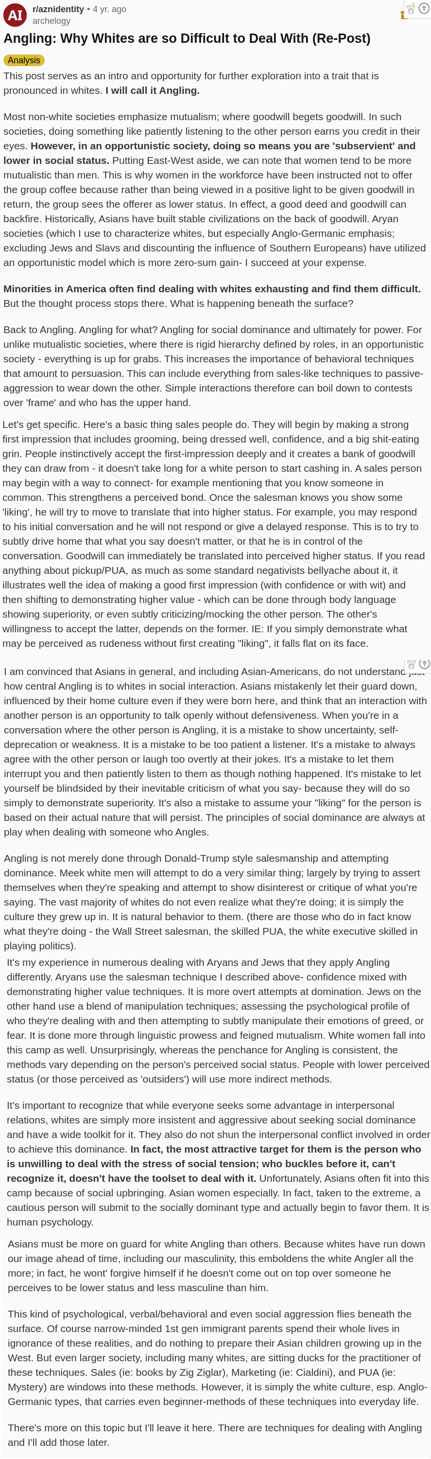 I am convinced that Asians in general, and including Asian-Americans, do not understand just how central Angling is to whites in social interaction. Asians mistakenly let their guard down, influenced by their home culture even if they were born here, and think that an interaction with another person is an opportunity to talk openly without defensiveness. When you’re in a conversation where the other person is Angling, it is a mistake to show uncertainty, self-deprecation or weakness. It is a mistake to be too patient a listener. It’s a mistake to always agree with the other person or laugh too overtly at their jokes. It’s a mistake to let them interrupt you and then patiently listen to them as though nothing happened. It’s mistake to let yourself be blindsided by their inevitable criticism of what you say- because they will do so simply to demonstrate superiority. It’s also a mistake to assume your “liking” for the person is based on their actual nature that will persist. The principles of social dominance are always at play when dealing with someone who Angles.