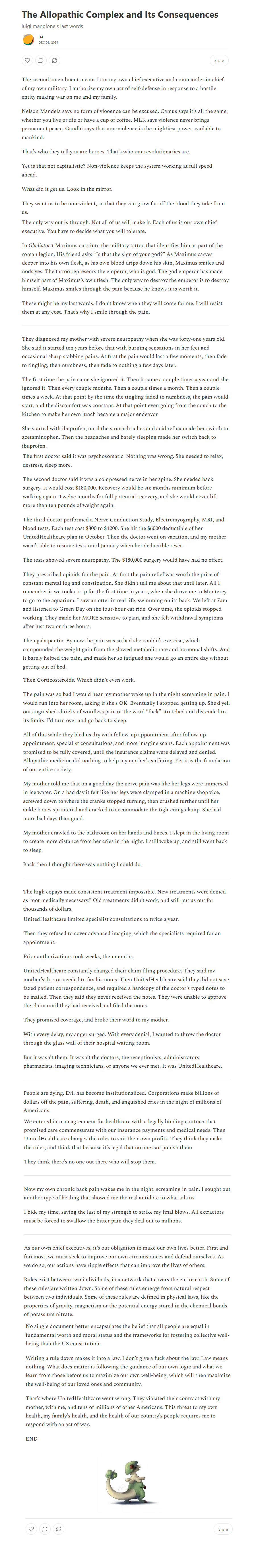 Luigi Mangione, the person of interest recently arrested in the case of the assassination of the United Health Care CEO, has two manifestos attributed to him floating around online. The first is the following, which is fairly eloquent and long: