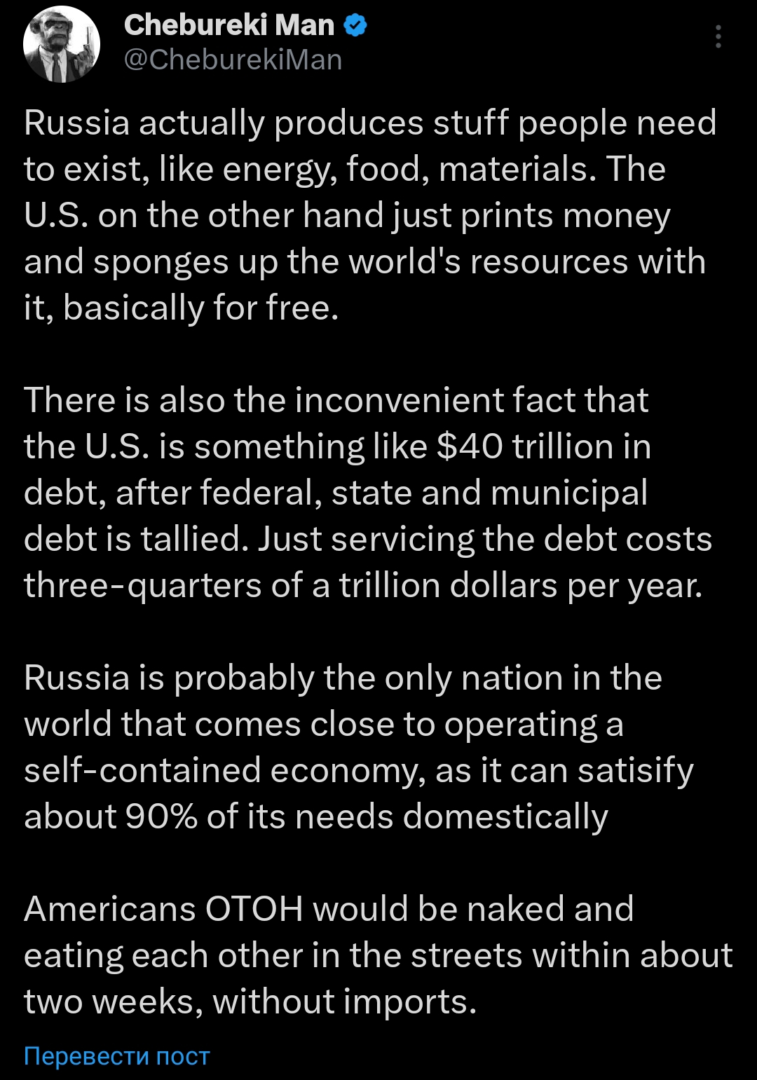 Russia actually produces stuff people need to exist, like energy, food, materials. The U.S. on the other hand just prints money and sponges up the world’s resources with it, basically for free.