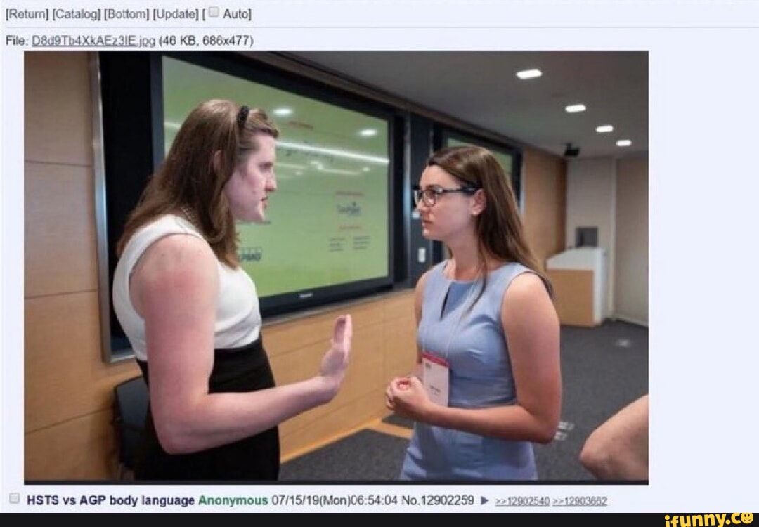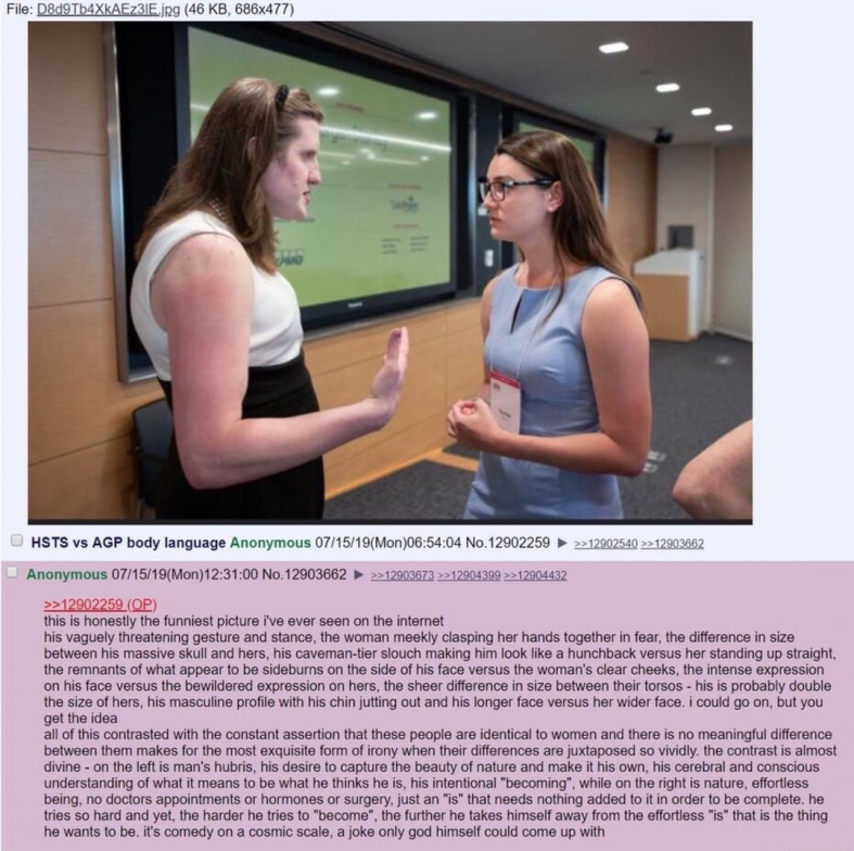 The irony is that the original thread, from some unknown 4chan styled image board, is titled “HSTS vs AGP body language”. There is a real chance that both people featured in the image were born as males. We’ll never know for sure, though.