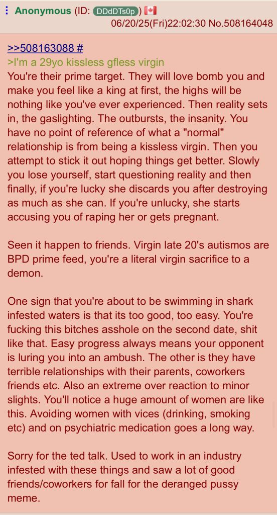 You’re their prime target. They will love bomb you and make you feel like a king at first, the highs will be nothing like you’ve ever experienced. Then reality sets in, the gaslighting. The outbursts, the insanity. You have no point of reference of what a “normal” relationship is from being a kissless virgin. Then you attempt to stick it out hoping things get better. Slowly you lose yourself, start questioning reality and then finally, if you’re lucky she discards you after destroying as much as she can. If you’re unlucky, she starts accusing you of raping her or gets pregnant.Seen it happen to friends. Virgin late 20s autismos are BPD prime feed, you’re a literal virgin sacrifice to a demon.