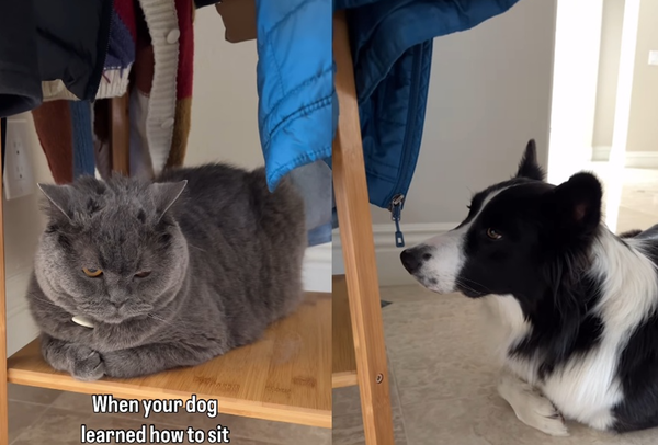 A young woman’s border collie dog has learned how to sit from the family cat: