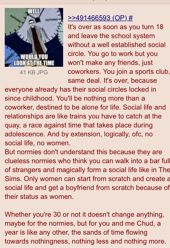 It’s over as soon as you turn 18 and leave the school system without a well established social circle. You go to work but you won’t make any friends, just coworkers. You join a sports club, same deal. It’s over, because everyone already has their social circles locked in since childhood. You’ll be nothing more than a coworker, destined to be alone for life. Social life and relationships are like trains you have to catch at the quay, a race against time that takes place during adolescence. And by extension, logically, ofc, no social life, no women.