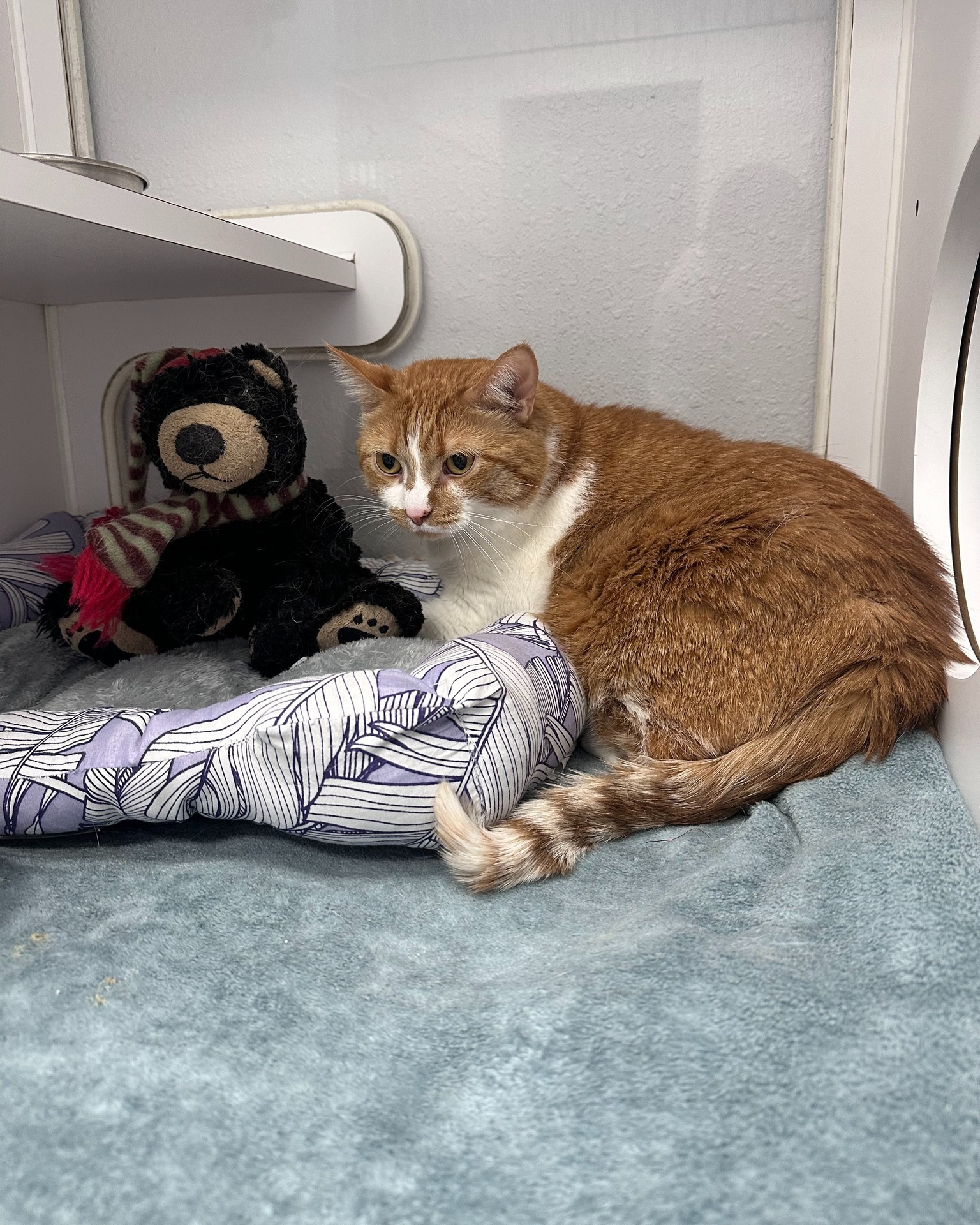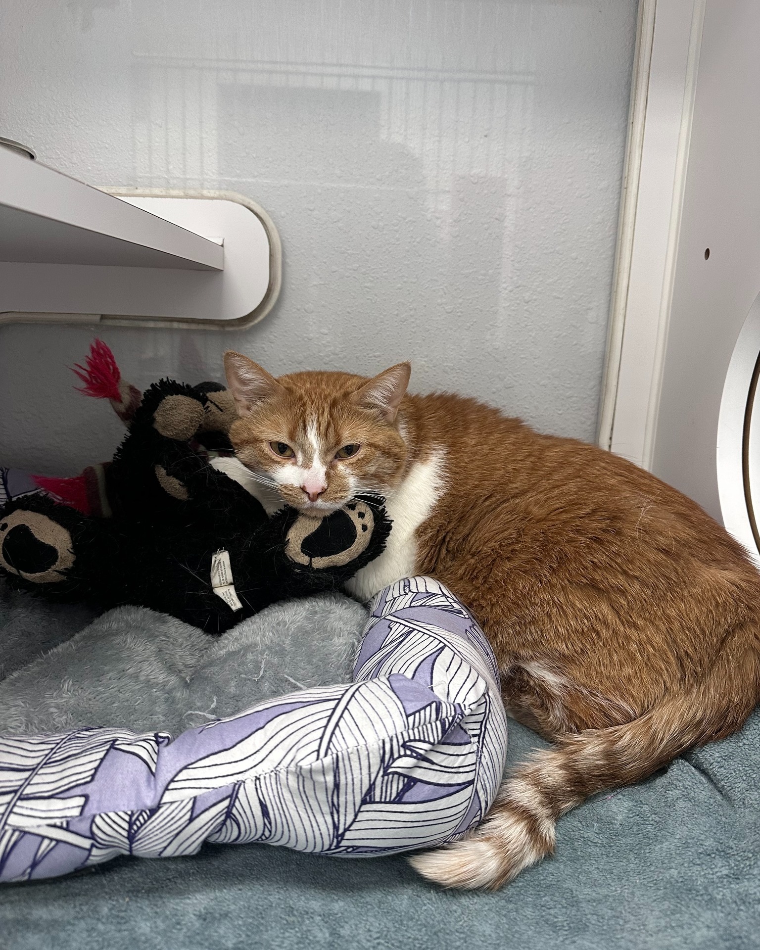 Zoey was surrendered to our partner with a simple note: “Don’t take away Zoey’s Bear.” Sure enough, when the two were briefly separated (it needed a little dust-off), Zoey was visibly stressed in his condo. The moment his bear was returned, he melted back into himself. Since then, he’s rarely out of paw’s reach, often curled up and cuddling.